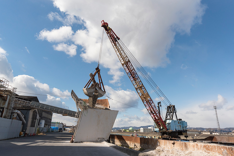 カキ殻を堆積場から工場へ運搬し、製造がはじまります。